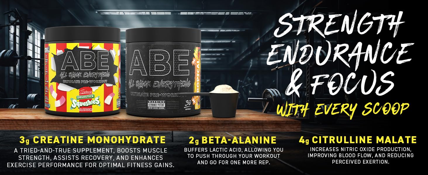 All Black Everything Pre Workout . ABE All Black Everything Ultimate PreWorkout A1 Supplements It contains a potent blend of ingredients that work together to give you an intense and sustained energy boost during your workouts. All Black Everything Pre Workout Powder | 30 Servings | Bubblegum Crush | 350mg Caffeine | Nootropic Pre-Workout Blend | Beta Alanine + Citrulline | Energy Supplement for Men and Women
